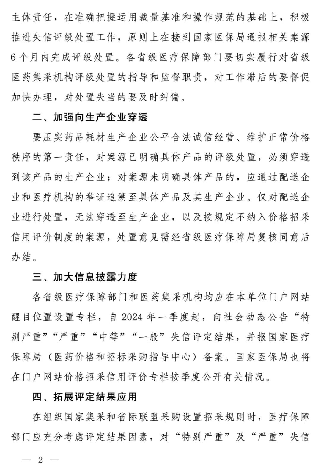 根据通知,各省级医疗保障部门和医药集采机构均应在本单位门户网站醒目位置设置专栏,自2024年一季度起,向社会动态公告“特别严重”“严重”“中等”“一般”失信评定结果,并报国家医疗保障局 (医药价格和招标采购指导中心) 备案。