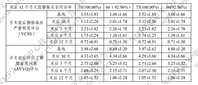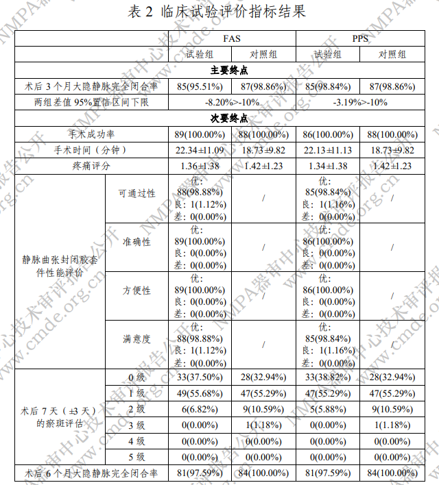该临床试验在 9 家临床机构开展,实际共入组 179 例受试者(试验组 90 例,对照组 89 例),其中,FAS 集 177 例(试验组 89 例,对照组 88 例);PPS 集 174 例(试验组 86例,对照组 88 例);SS 集 177 例(试验组 89 例,对照组88 例)。主要有效性终点为术后 3 个月大隐静脉完全闭合率,次要有效性终点为手术成功率;手术时间;疼痛评分;静脉曲张封闭胶套件性能评价;术后 7 天(±3 天)的瘀斑评估;术后 6 个月、12 个月大隐静脉完全闭合率;手术前后静脉临床严重程度评分(VCSS);手术前后阿伯丁静脉曲张问卷(AVVQ)评分。临床试验主要/次要终点评价指标结果如下表所示。